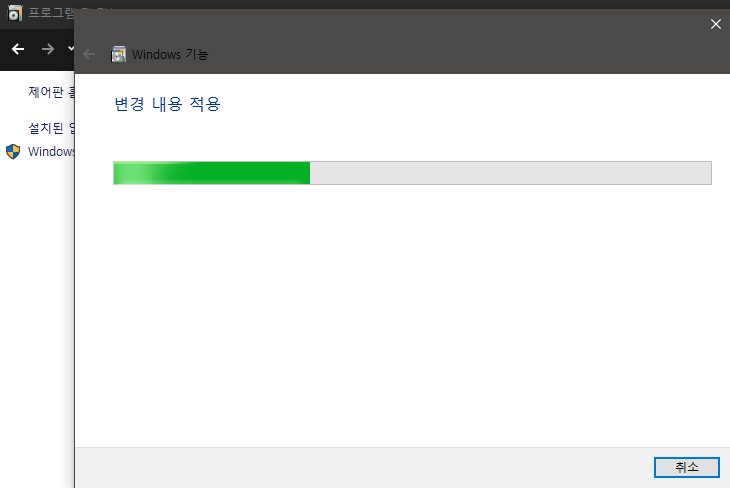 세 번째의 윈도우용 컨테이너 사용에는 체크하지 말고 OK를 누릅니다. 그러면 설치가 알아서 됩니다. 그리고 또 재부팅을 해야합니다.