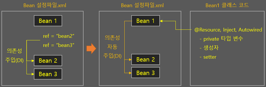 필드명 또는 생성자 파라미터 변수의 이름과 Bean 객체의 ID를 매핑시켜서 먼저 찾는 방식입니다. 만약 매핑되는 ID가 없으면 타입을 검색해서 찾아줍니다. 그런데 같은 타입도 없다면 예외를 발생시킵니다. (name="ID")로 ID를 강제 지정할 수도 있습니다.