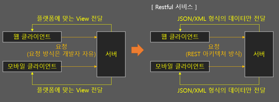 일반적인 서비스의 경우 요청받은 내용을 처리하고 데이터를 가공해서 처리 결과를 특정 플랫폼에 적합한 형태의 View로 만들어 되돌려주는 반면, Restful 서비스에서는 그냥 데이터만 처리하고 끝내거나 되돌려줄 데이터가 있다면 JSON이나 XML 형식으로 전달해줍니다. View에 대해서는 전혀 신경쓰지 않습니다.