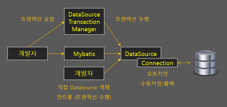 하지만 Spring JDBC나 Mybitis에서는 DataSource 객체만 제공해주면 커넥션을 알아서 생성해 사용하므로 개발자가 직접 위와 같은 방법으로 오토커밋을 해제하고 커밋/롤백을 자유롭게 사용할 수가 없습니다. 따라서 스프링에서 트랜잭션을 관리해주는 객체에다가 DataSource 객체(Bean)를 넘긴 뒤, 해당 객체를 사용해 트랜잭션을 관리하면 됩니다.