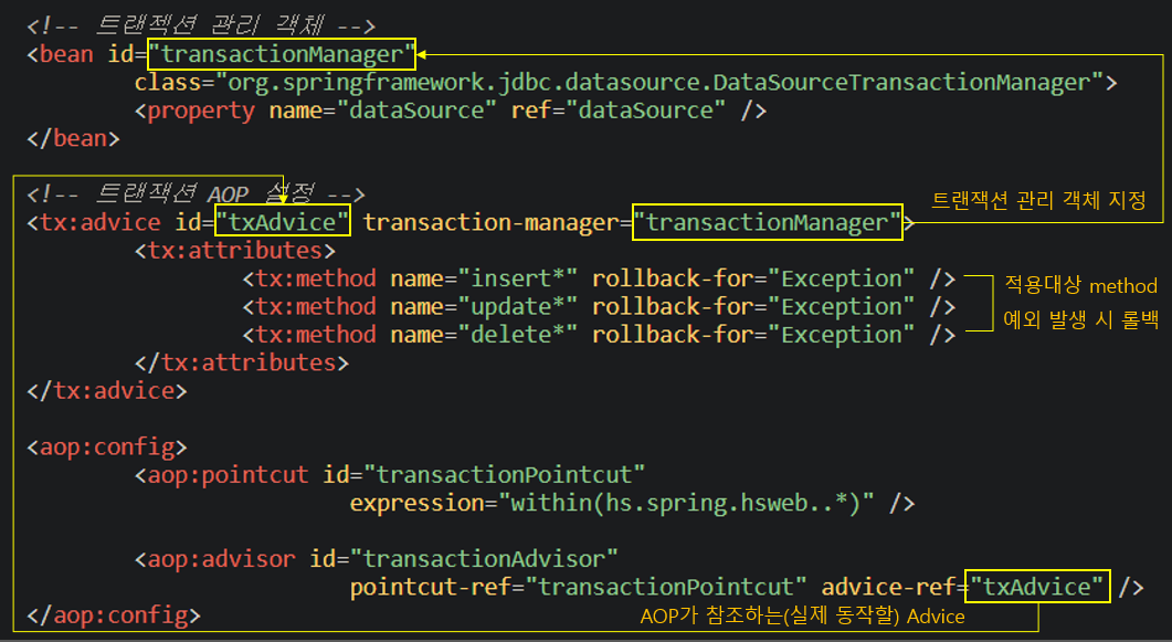 스프링에서 제공하는 트랜잭션을 위한 AOP 설정입니다. 'tx'는 Transaction을 의미합니다. AOP 클래스를 이용해 작성할 수 있지만 xml에 설정에주는 것이 훨씬 간결하고 편리합니다. 외워서 쓰기도 힘드니 초기 셋팅할 때 찾아서 붙여넣고 사용하면 될 것 같습니다. 코드 자체는 직관적이어서 이해가 어렵진 않습니다.