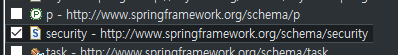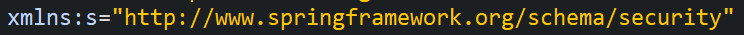Spring security 설정에 필요한 네임 스페이스입니다. 체크하면 security에 대한 네임스페이스가 생기는데, 그대로 security로 써도 되고 위의 코드와 같이 간단한 문자('s' 등)로 변경해서 사용해도 됩니다.