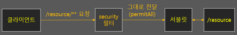 * 정적 리소스 경로(/resources/**)는 권한에 관계없이 서블릿으로 보내주겠다.