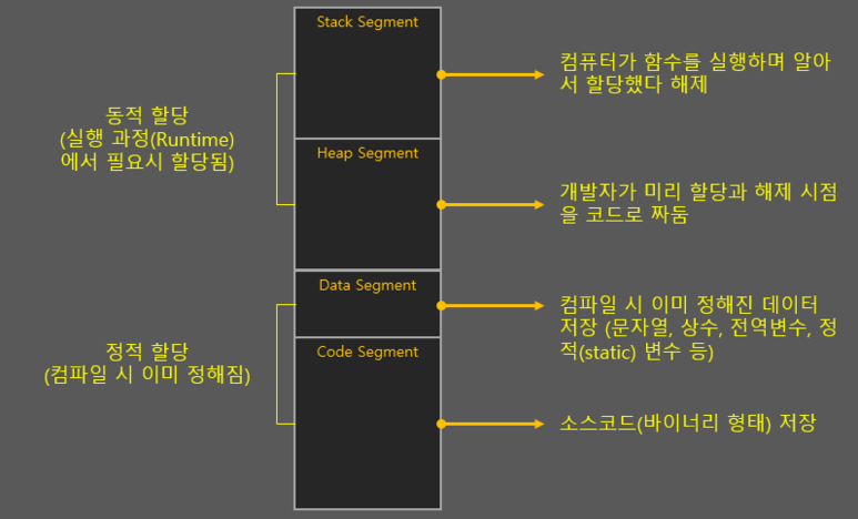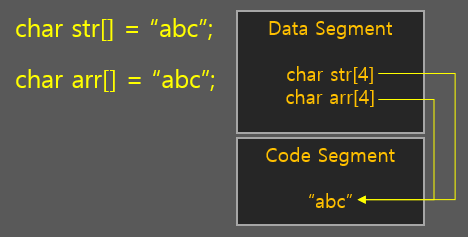 - 만약 문자열 변수가 초기화된 문자열이라면, 문자열 자체는 Data Sement에 저장됨