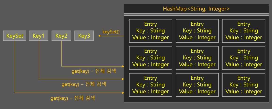 keySet() 메소드를 실행해 Key값으로 이루어진 Set을 받아 순회하는 것까지는 별 상관이 없습니다. 하지만 그 이후 다시 get(key)를 해버리면 Set과 관계없이 다시 HashMap으로 가서 해당 Key가 가진 Value를 찾는 작업을 계속 반복하게 된다는 의미입니다.
