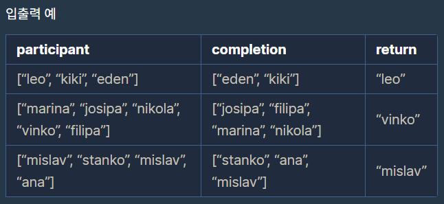 수많은 마라톤 선수들이 마라톤에 참여하였습니다. 단 한 명의 선수를 제외하고는 모든 선수가 마라톤을 완주하였습니다. 마라톤에 참여한 선수들의 이름이 담긴 배열 participant와 완주한 선수들의 이름이 담긴 배열 completion이 주어질 때, 완주하지 못한 선수의 이름을 return 하도록 solution 함수를 작성해주세요. 제한사항