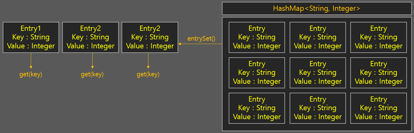 해싱 기반이라 검색이 빨라서 크게 문제가 안될 수 있지만 기본 API에서는 이런 경우를 방지하기 위해 더 좋은 기능을 제공해줍니다. Key값만 Set으로 가져오는게 아니라 위의 Entry 객체 자체를 Set으로 가져오는 것이죠.