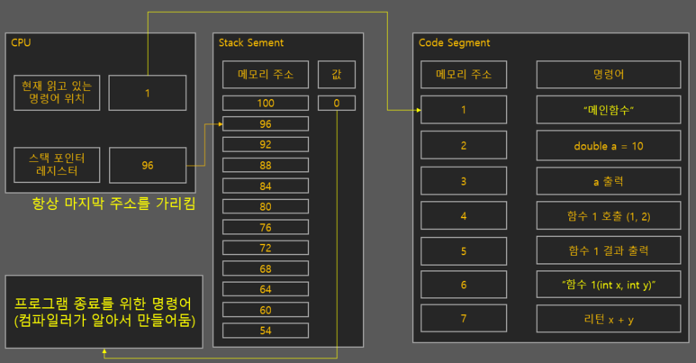 CPU는 명령어 위치를 주면 순서대로 읽어나갑니다. 그냥 적힌 내용대로 수행만 할 뿐 아무 생각이 없습니다. 프로그램 실행의 준비가 끝나면 프로그램 종료를 담당하는 명령어가 들어 있는 위치를 스택에 하나 넣고 메인함수를 읽기 시작합니다. 스택 포인터 레지스터는 항상 스택의 마지막 주소를 가리키고 있습니다.