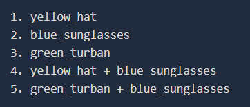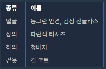 스파이들은 매일 다른 옷을 조합하여 입어 자신을 위장합니다. 예를 들어 스파이가 가진 옷이 아래와 같고 오늘 스파이가 동그란 안경, 긴 코트, 파란색 티셔츠를 입었다면 다음날은 청바지를 추가로 입거나 동그란 안경 대신 검정 선글라스를 착용하거나 해야 합니다.