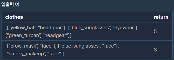 ![]() 스파이가 가진 의상들이 담긴 2차원 배열 clothes가 주어질 때 서로 다른 옷의 조합의 수를 return 하도록 solution 함수를 작성해주세요.