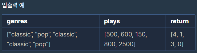 해시와 정렬이 섞인 문제입니다. 보시다시피 장르 이름이라는 "문자열" 배열이 주어지고 특히 중복되는 문자열을 걸러내야 하는 로직이 있습니다. 이럴 경우 해시를 먼저 떠올립니다. 실제 문제 풀 때 카테고리를 알려주진 않으니까요. ㅎㅎ