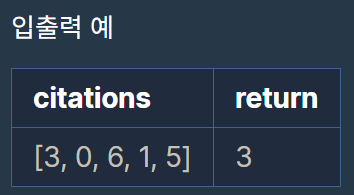 H-Index는 과학자의 생산성과 영향력을 나타내는 지표입니다. 어느 과학자의 H-Index를 나타내는 값인 h를 구하려고 합니다. 위키백과1에 따르면, H-Index는 다음과 같이 구합니다. 어떤 과학자가 발표한 논문 n편 중, h번 이상 인용된 논문이 h편 이상이고 나머지 논문이 h번 이하 인용되었다면 h의 최댓값이 이 과학자의 H-Index입니다. 어떤 과학자가 발표한 논문의 인용 횟수를 담은 배열 citations가 매개변수로 주어질 때, 이 과학자의 H-Index를 return 하도록 solution 함수를 작성해주세요. 제한사항