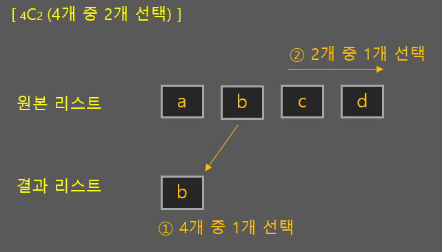 하지만 조합에서는 "a"가 포함된 부분집합을 모두 구한 뒤에는 더 이상 "a"를 선택할 필요가 없습니다. "b"로 시작할 때는 이후 원소들에서만 뽑아오면 됩니다. 따라서 기준이 "b"라면 다음 재귀함수는 "b"다음 인덱스부터 시작하면 되기 때문에 원본 배열을 굳이 건드릴 이유가 없게 됩니다.