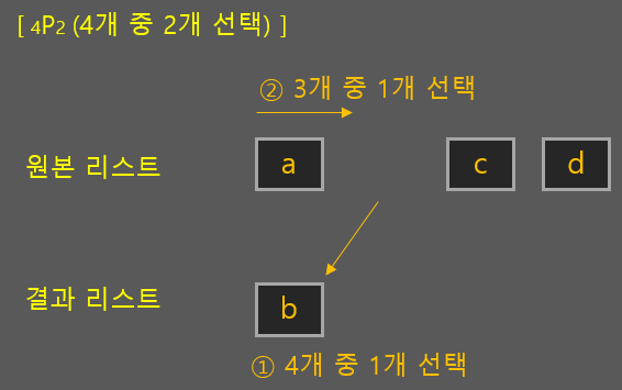 순열에서는 자기 자신을 제외하고 모든 원소를 처음부터 검색해 조합해야했기 때문에 재귀함수를 이용하기 위해 원본 배열에서 해당 원소를 뺐다가 붙였다가를 반복했습니다. "c"가 제일 앞에 오는 경우 나머지 원소들의 부분집합을 처음부터 추가해줘야 하기 때문이죠.