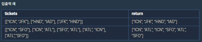 입출력 예 설명 예제 #1 [ICN, JFK, HND, IAD] 순으로 방문할 수 있습니다. 예제 #2 [ICN, SFO, ATL, ICN, ATL, SFO] 순으로 방문할 수도 있지만 [ICN, ATL, ICN, SFO, ATL, SFO] 가 알파벳 순으로 앞섭니다. |