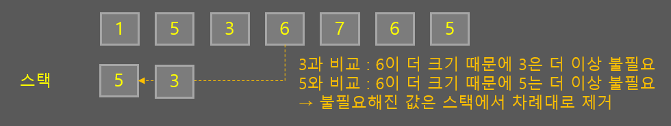 따라서 왼쪽부터 순회하면서 자신보다 큰 숫자가 나오면 자신은 더 이상 쓸모가 없어져 빠지고, 자신보다 작은 숫자라면 그 오른쪽 숫자가 자신보다 나중에 들어온(작은) 숫자를 먼저 비교해보고 자신에게 도달해야므로 후입선출의 스택 구조로 비교할 수 있는 것입니다.