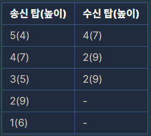 문제 설명 수평 직선에 탑 N대를 세웠습니다. 모든 탑의 꼭대기에는 신호를 송/수신하는 장치를 설치했습니다. 발사한 신호는 신호를 보낸 탑보다 높은 탑에서만 수신합니다. 또한, 한 번 수신된 신호는 다른 탑으로 송신되지 않습니다. 예를 들어 높이가 6, 9, 5, 7, 4인 다섯 탑이 왼쪽으로 동시에 레이저 신호를 발사합니다. 그러면, 탑은 다음과 같이 신호를 주고받습니다. 높이가 4인 다섯 번째 탑에서 발사한 신호는 높이가 7인 네 번째 탑이 수신하고, 높이가 7인 네 번째 탑의 신호는 높이가 9인 두 번째 탑이, 높이가 5인 세 번째 탑의 신호도 높이가 9인 두 번째 탑이 수신합니다. 높이가 9인 두 번째 탑과 높이가 6인 첫 번째 탑이 보낸 레이저 신호는 어떤 탑에서도 수신할 수 없습니다.