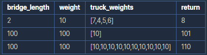 따라서, 모든 트럭이 다리를 지나려면 최소 8초가 걸립니다. solution 함수의 매개변수로 다리 길이 bridge_length, 다리가 견딜 수 있는 무게 weight, 트럭별 무게 truck_weights가 주어집니다. 이때 모든 트럭이 다리를 건너려면 최소 몇 초가 걸리는지 return 하도록 solution 함수를 완성하세요.