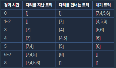 트럭 여러 대가 강을 가로지르는 일 차선 다리를 정해진 순으로 건너려 합니다. 모든 트럭이 다리를 건너려면 최소 몇 초가 걸리는지 알아내야 합니다. 트럭은 1초에 1만큼 움직이며, 다리 길이는 bridge_length이고 다리는 무게 weight까지 견딥니다. 예를 들어, 길이가 2이고 10kg 무게를 견디는 다리가 있습니다. 무게가 [7, 4, 5, 6]kg인 트럭이 순서대로 최단 시간 안에 다리를 건너려면 다음과 같이 건너야 합니다.