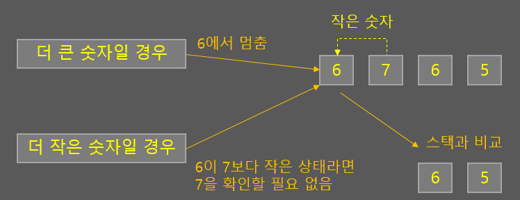 뒤에서부터 순회를 할 때 앞쪽에 자신보다 작은 숫자가 앞에 있다면 자신은 굳이 스택에 들어가지 않아도 된다는 의미입니다. 그리고 마찬가지로 더 작은 숫자가 나와 스택에 쌓여있는 숫자들과 차례로 비교를 할 때 자신보다 큰 숫자를 모두 지워주면 됩니다. 뒷쪽에 자신보다 큰 숫자는 의미가 없기 때문입니다. 이 원리만 이해하면 로직을 짜는 것은 크게 어렵지 않을 것 같습니다.