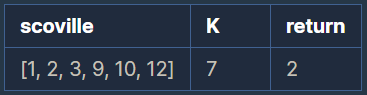 매운 것을 좋아하는 Leo는 모든 음식의 스코빌 지수를 K 이상으로 만들고 싶습니다. 모든 음식의 스코빌 지수를 K 이상으로 만들기 위해 Leo는 스코빌 지수가 가장 낮은 두 개의 음식을 아래와 같이 특별한 방법으로 섞어 새로운 음식을 만듭니다. - 섞은 음식의 스코빌 지수 = 가장 맵지 않은 음식의 스코빌 지수 + (두 번째로 맵지 않은 음식의 스코빌 지수 * 2)