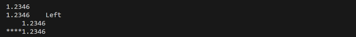 print("{0:<10.4f}Left".format(1.23456789)) # 10칸 공간 중 왼쪽 정렬