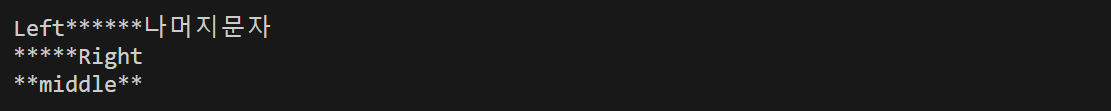 위에서 준 공백을 다른 문자로 채울 수 있습니다. 왼쪽(:<) 오른쪽(:>) 가운데(^) 기호에 문자를 넣어주면 됩니다.