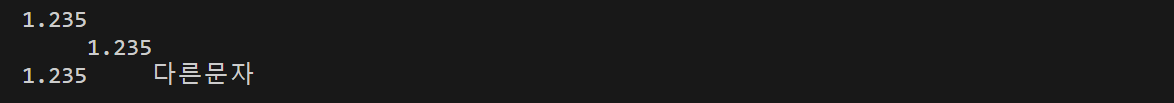print("%-10.3f다른문자" % 1.2345678) # 10개 공간 중 왼쪽 정렬