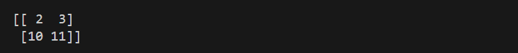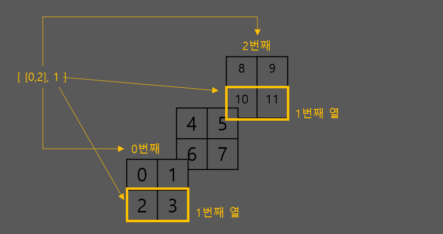 아래와 같이 복잡한 인덱싱도 가능합니다. 0번째와 2번째의 2차원 행렬에서 1번째 열을 가지고 오라는 의미입니다. 역시 2개의 인덱스를 사용한 셈이기 때문에 2차원 행렬로 나타납니다.