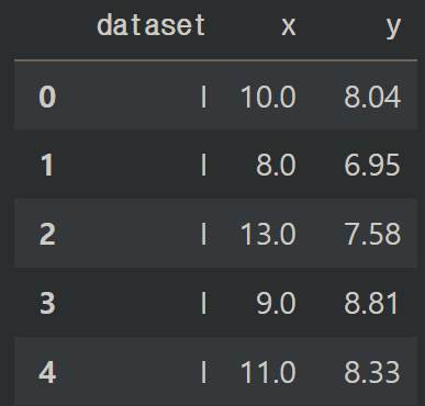 일단 테스트 데이터를 로드해줍니다. seaborn 라이브러리에서 제공하는 "anscombe" 데이터를 사용해봅니다.