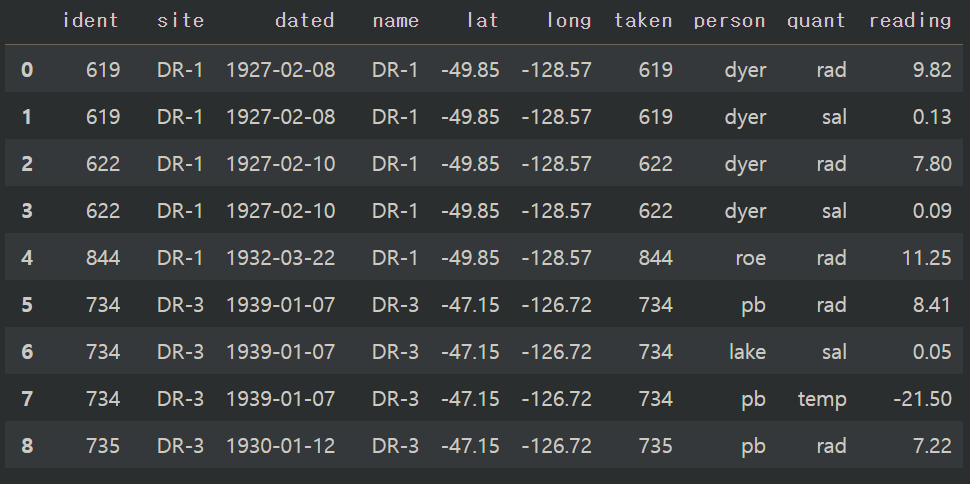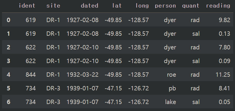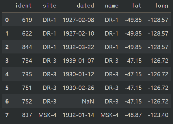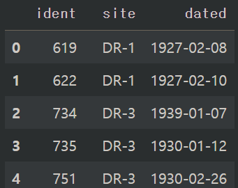 site와 visited는 각각 "name - site"의 공통 키가 있고 servey와 visited는 "taken - ident"라는 공통점이 있습니다.