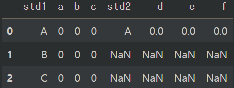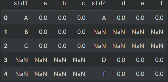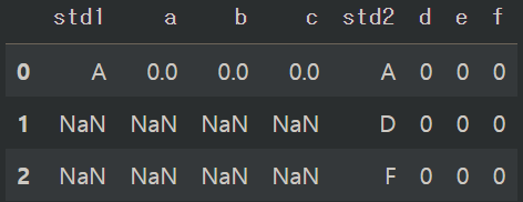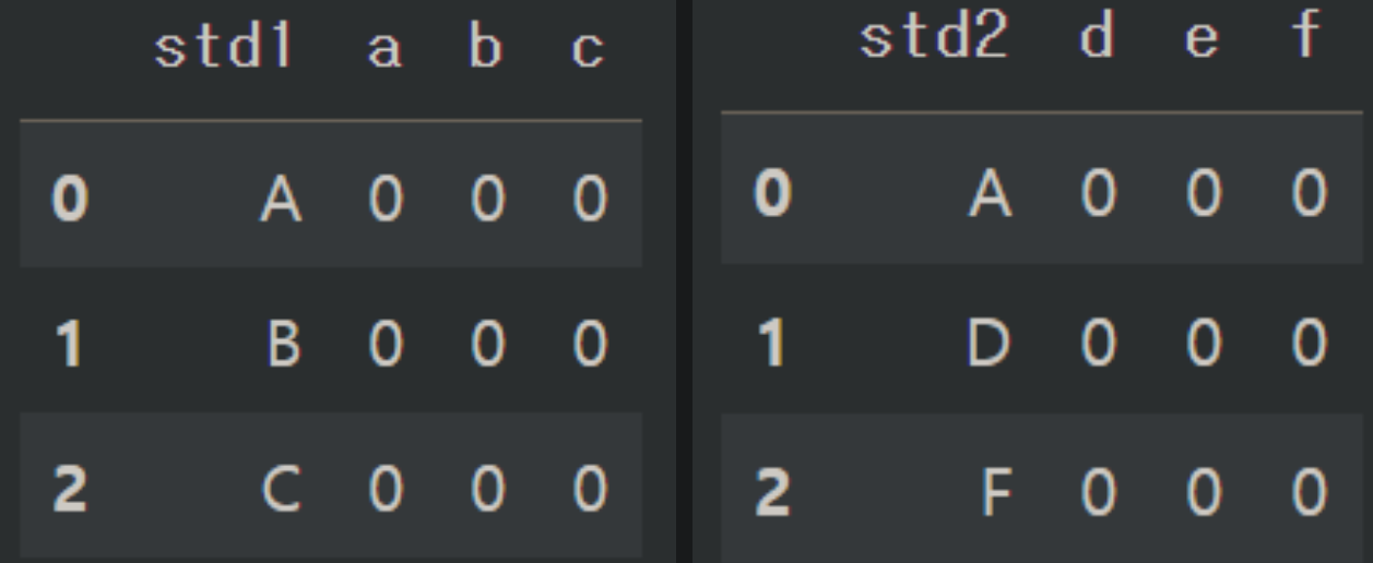 df2 = pd.DataFrame([["A",0,0,0],["D",0,0,0],["F",0,0,0]], columns = ["std2", "d", "e", "f"])