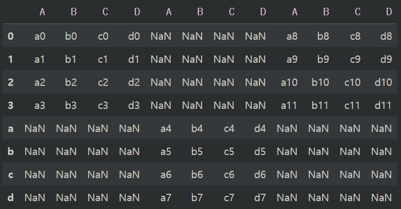 합쳐지는 데이터프레임에 기준이 되는 인덱스나 컬럼명이 다를 경우에도 합쳐집니다. 다만 서로 중복되지 않는 데이터는 'NaN' 처리됩니다.