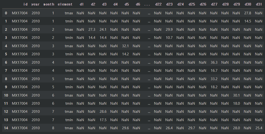 엑셀 피봇을 생각해보면 위 자료에서 계속 중복되는 "tmax"와 "tmin" 값을 위로 올려주고 NaN값을 필터링해주면 깔끔하게 정리됩니다.