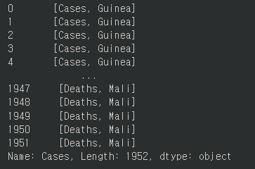먼저 나눌 컬럼 "country2["Cases"]를 str 클래스를 써서 나눠줍니다. split()은 나눠진 문자열의 배열로 이루어진 시리즈를 반환합니다.
