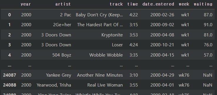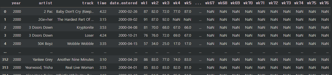 billboard2 = pd.melt(billboard, id_vars = ["year", "artist", "track", "time", "date.entered"],