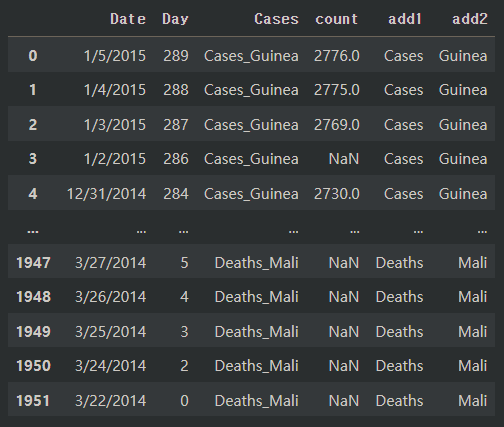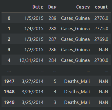 country2 = pd.melt(country, id_vars = ["Date", "Day"], var_name = "Cases", value_name = "count")
