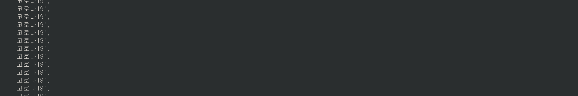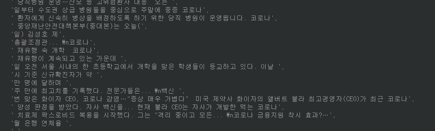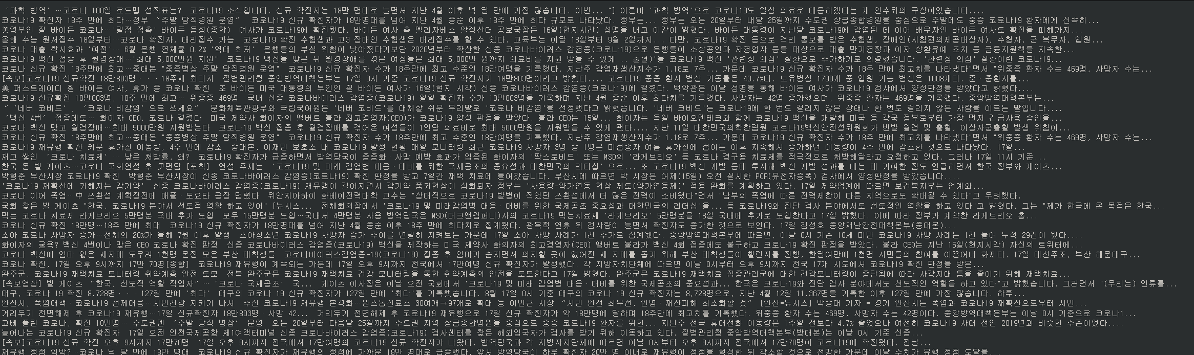 먼저 문서를 하나 열어줍니다. 코로나로 검색한 뉴스 검색 결과가 어지럽게 나와있는 자료입니다.