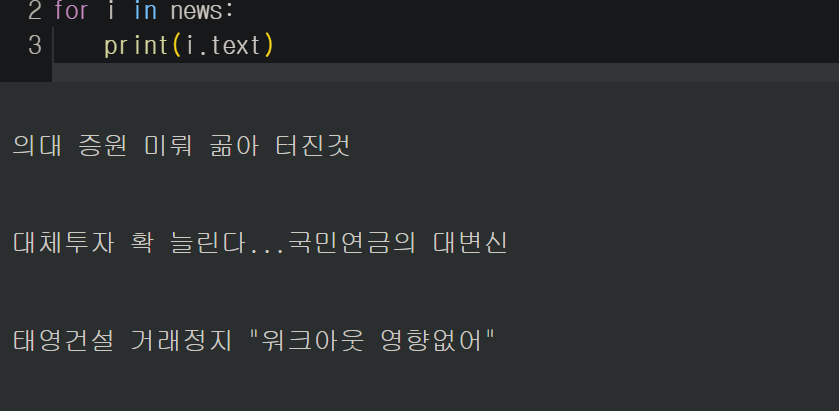먼저 제목의 경우 유일하게 포함된 텍스트이기 때문에 그냥 text 함수를 통해 걸러내주면 됩니다. findall 함수로 받아진 객체는 text를 바로 사용할 수 없기 때문에 반복문을 통해서 하나씩 꺼내줘야합니다.