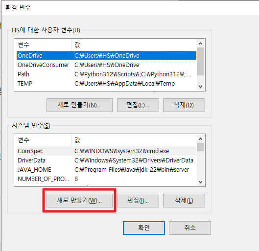 "시스템 변수"의 "새로 만들기"를 클릭합니다.