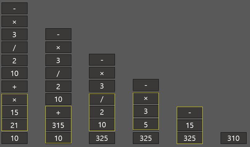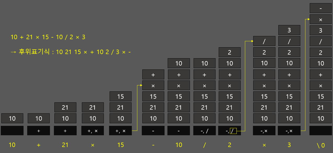 char form[] = "10+21*15-10/2*3"; // 후위표기식 : 10 21 15 * 10 2 / 3 * - +