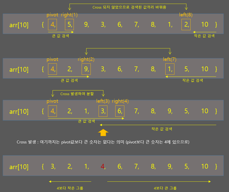 - 오른쪽으로는 피봇값보다 큰 숫자를 찾고 왼쪽으로는 작은 숫자를 찾음
