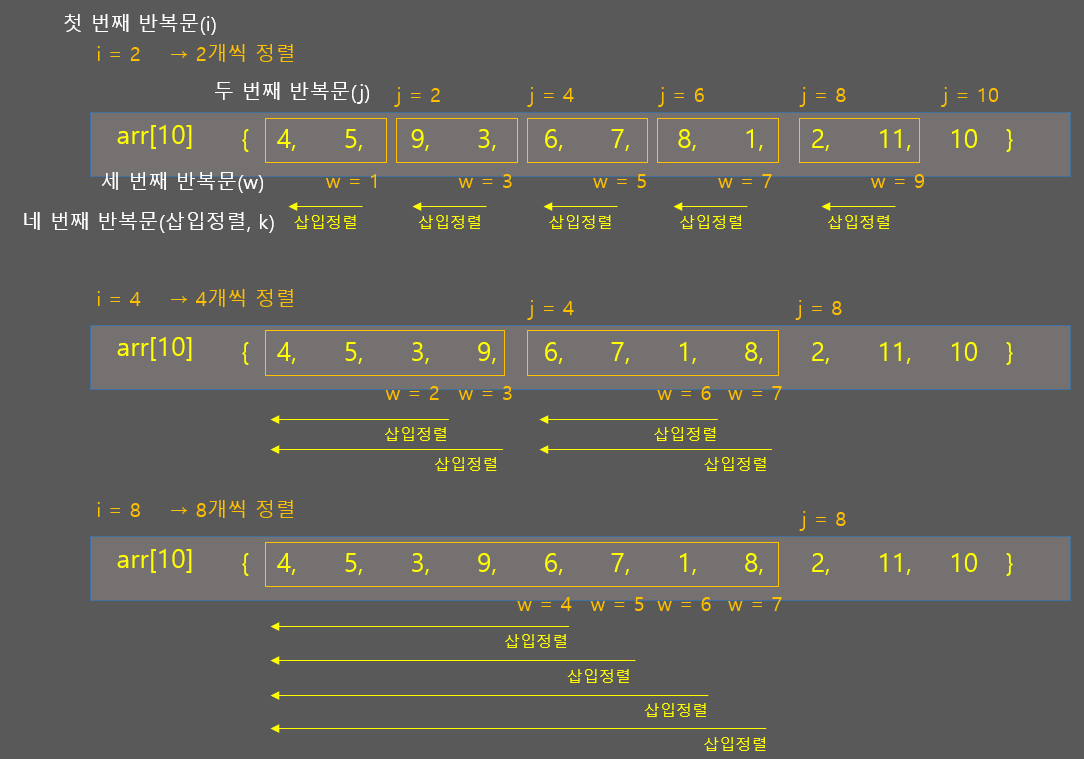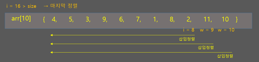 // 전체범위(j-i) ~ (j-1), 대상범위(j-i/2)~(j-1) -> 삽입정렬 수행