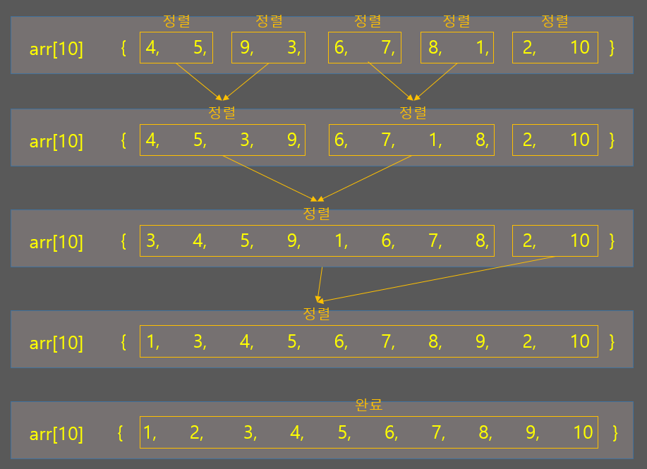 - 이미 정렬된 소그룹을 계속해서 합쳐 나가는 방식으로 O(n*logN)의 시간 복잡도를 보장