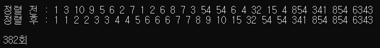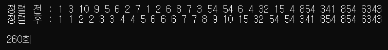 일단 샘플로 넣어본 배열에서는 위와 같은 결과가 나왔습니다. 제 예상과는 다르게 swap을 한번 할 때 연산횟수가 3번이어서 강의 코드와 수행횟수 차이가 많이 나네요. 메모리 공간은 사실 동적할당해서 잠시 쓰고 버리면 되기에.. 강의 코드에 한표를 던지며 이번글은 마무리를 하겠습니다. ㅎㅎ