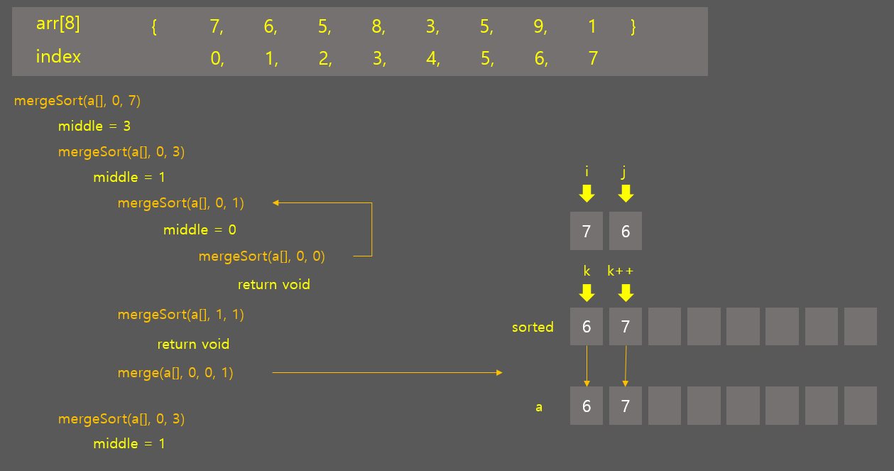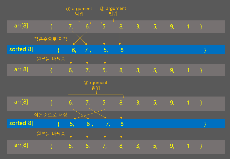 범위를 재귀함수로 쪼갠 뒤에는 아래의 로직을 반복 수행해 정렬해줍니다. 원본 배열과 동일한 크기의 sorted라는 배열을 새로 만들어줘야하고, sorted에 복사했다가 원본에 복사했다가 하는 작업들이 발생해서 약간은 비효율적으로 보여지기도 합니다.