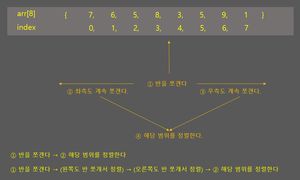 2. 첫번 째 분할값 기준 왼쪽 오른쪽 영역을 재귀함수의 argument로 던져줘서 동일 로직 수행