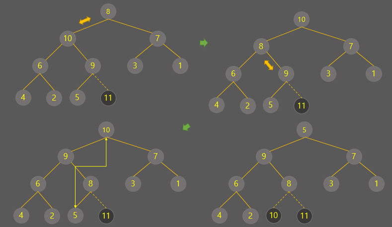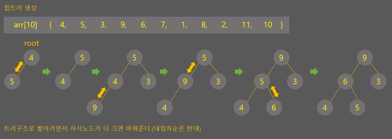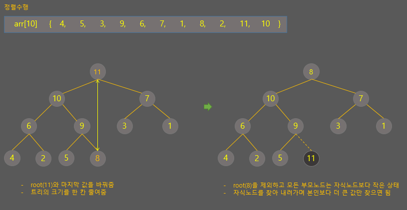 - 힙트리가 완성된 이후 root값을 마지막 값과 바꾼 후 다시 최대값을 찾음