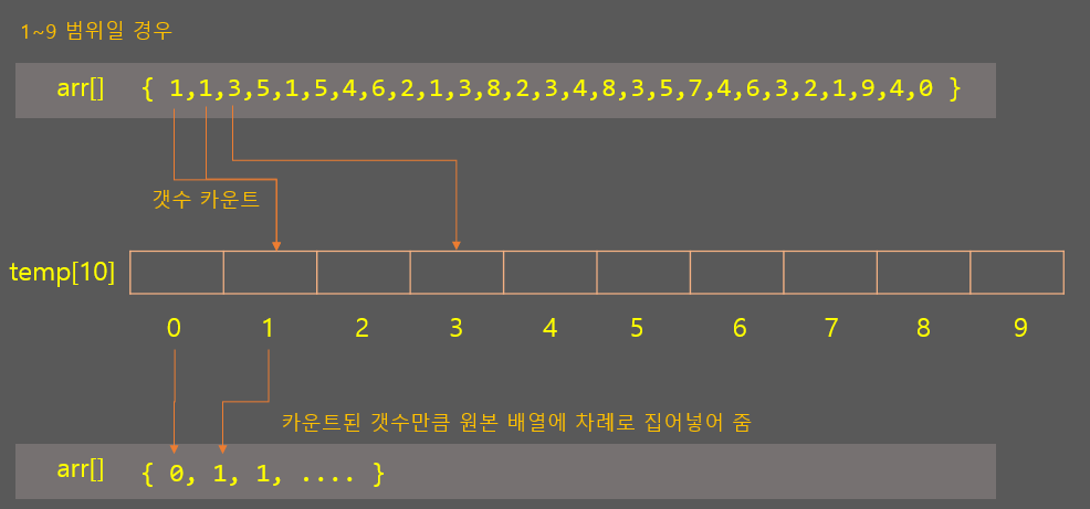기본적인 방식은 매우 좋습니다만.. 숫자 범위가 엄청 넓은데 띄엄띄엄 숫자가 존재할 경우에는 메모리 공간 낭비가 심하고 비효율적이 될 수 있습니다. 예를 들어 이 방식에서는 1 ~ 10000 까지의 숫자가 있을 때 temp[10000]의 임시 공간을 만들어줘야 한다는 단점이 있습니다. 중간에 빈 공간이 많이 발생할 수도 있구요. 해쉬방식으로 배열을 나누고 연결리스트 구조를 사용해도 되겠다는 생각은 들지만.. 그럴바에는 그냥 퀵,힙,병합정렬이 더 효율적으로 보입니다.