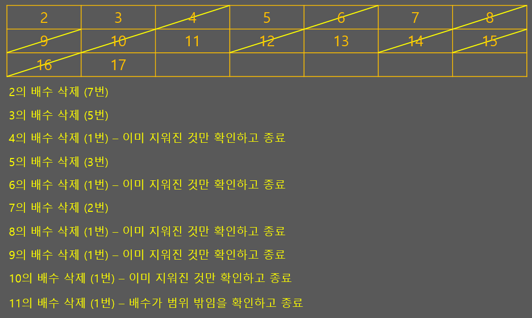 예를 들어 1~17 사이의 소수를 구하기 위한 위의 코드에서는 연산 횟수가 46번 이상 발생합니다. 하지만 아래와 같이 에라토스테네츠의 체를 이용하면 대략 23번의 연산이 발생합니다. 물론 범위 확인과 같은 이런저런 곁다리 연산들은 제외한 숫자입니다. 곁다리 연산은 양쪽에 다 있으니 단순 연산 횟수로만 비교해보면 거의 2배의 속도가 차이납니다. 범위가 커질 수록 그 차이는 더 많이 나겠네요.